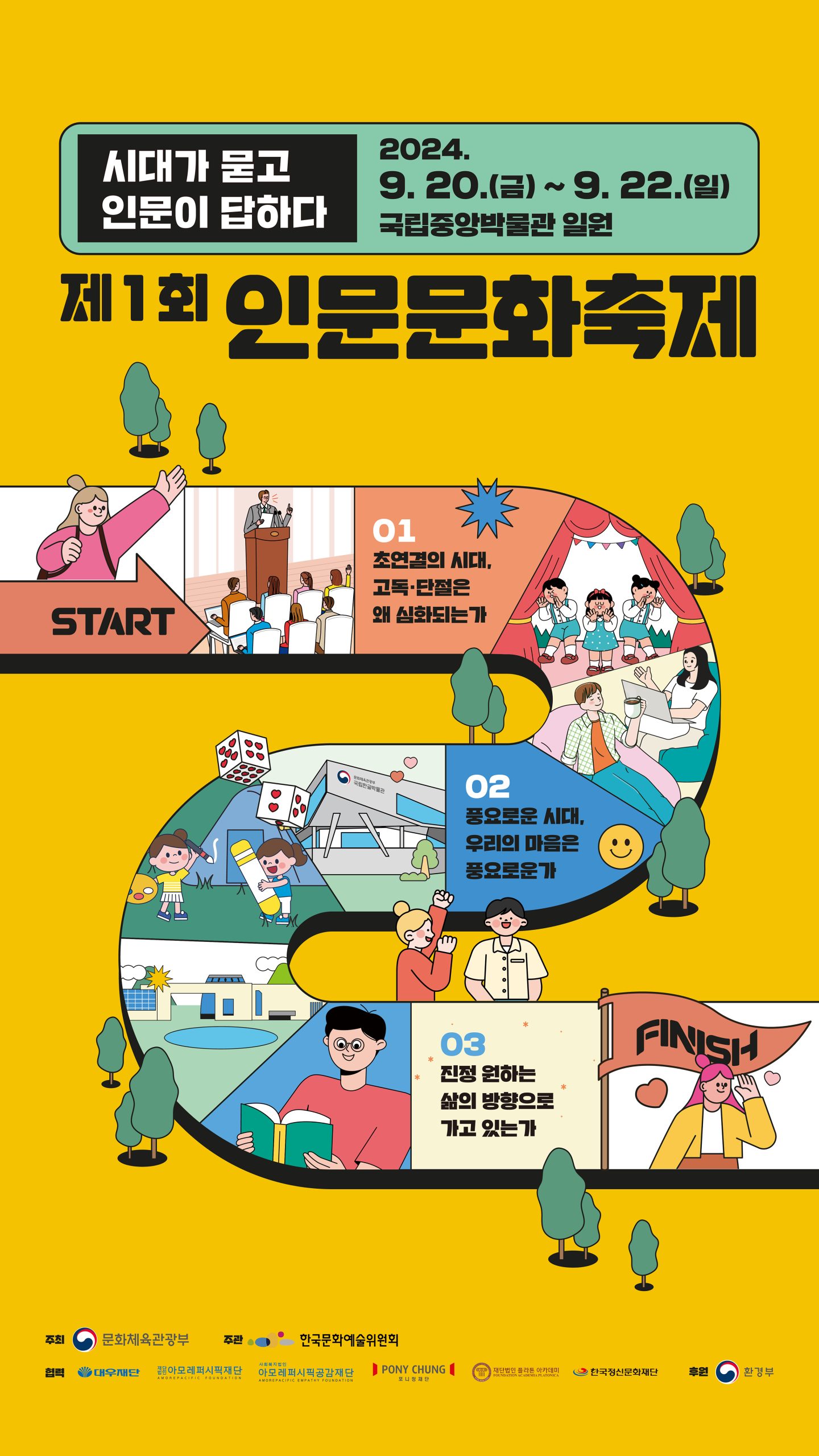 제1회 인문문화축제는 현대인의 혐오·갈등·고립감 등 지금 시대가 우리에게 던지는 질문들에 성찰·각성·소통·공감·연대 가치의 중요성을 담고 있는 인문에서 그 답을 찾아보고자 기획된 문화 축제입니다. 문화체육관광부가 주최하고 한국문화예술위원회가 주관합니다.