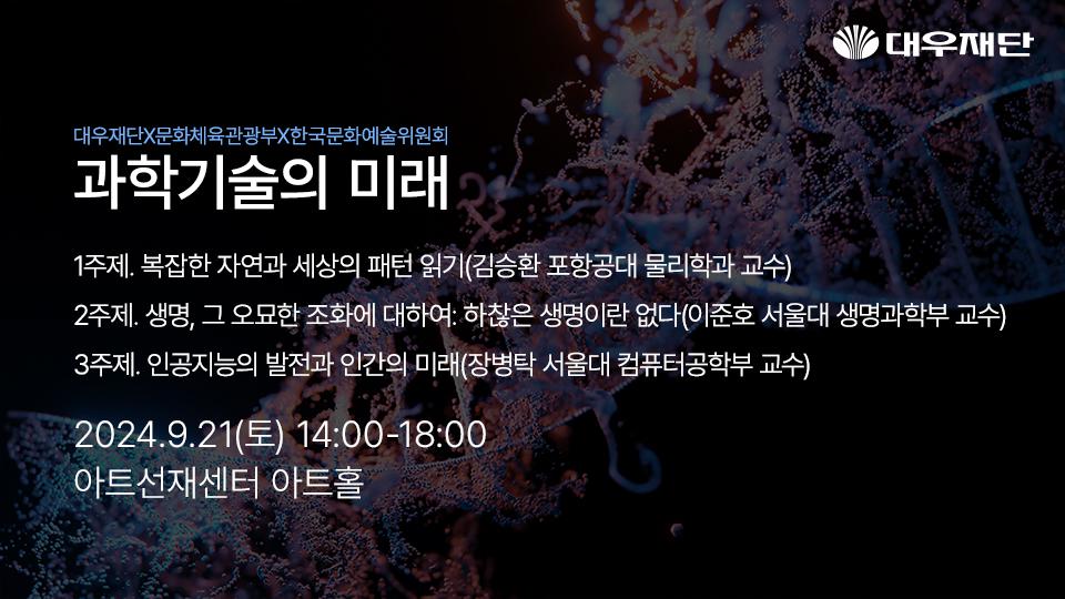 ‘과학기술의 미래’는 대우재단의 기획 공동연구의 두 번째 주제로 기후변화, 생명공학, 인공지능 등 과학기술이 고도화하는 세상에서 작은 인간을 조망하는 이야기입니다. 김승환 포항공과대학교 물리학과 교수님, 이준호 서울대학교 생명과학부 교수님, 장병탁 서울대학교 컴퓨터공학부 교수님 세 분께서 어려워 보이는 주제를 흥미진진하게 들려주실 예정입니다.