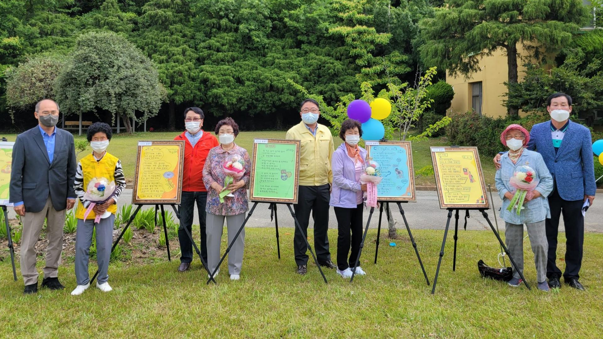 시화전 최종 결선 진출자와 참여 기관장 (왼쪽부터 김선협 대우재단 이사장, 고인례 님, 이두식 호남매일기자, 김복심 님, 이홍용 노화읍장, 김기심 님, 정종매 님, 박성규 완도군 군의원)