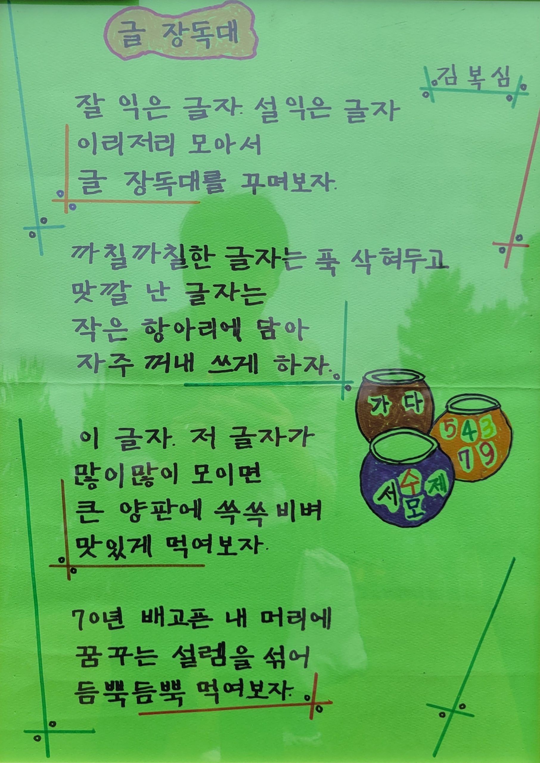 이어서 김복심 님이 노화읍노인대학을 대표해 자신의 시화 ‘글 장독대’를 낭송했습니다.