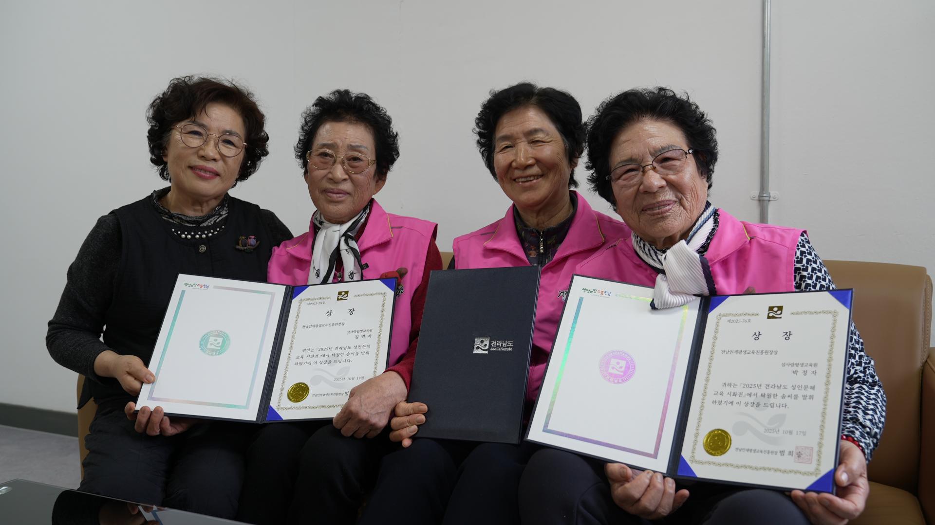 (왼쪽부터 차례로) 문해한글학교 섬사랑평생교육원 정정숙 원장, 김명자 학생, 김종임 학생, 박정자 학생이 상장을 들고서 환히 웃고 있다.