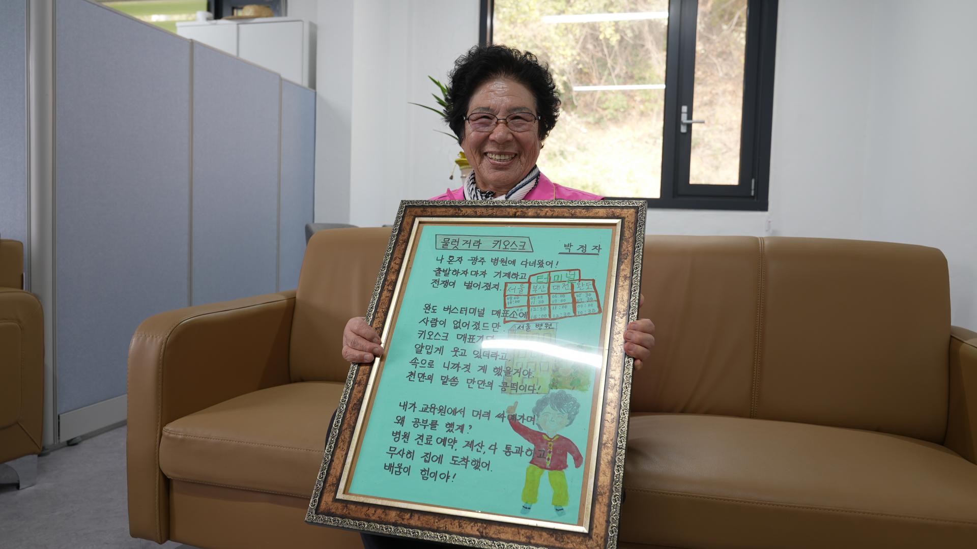 박정자 학생 수업에서 키오스크도 가르쳐줘요. 작동법을 배워 갖고 광주 지역병원 갔다 오면서 느낀 걸 시화전에 썼어요. 직접 내가 글자 다 쓴 거예요. 맘스터치에 들러서 햄버거 시키는 것도 배웠고, 또 광주로 병원 갈 일이 있어 완도 터미널에 들렀거든요. 키오스크 배운 거 있으니까 매표소에서 제가 착착 해부렀지요. 그래 (매표소 직원이) “어디 부녀회장 했어요?” 그라고 물어봐요.(웃음) 병원 원무과에선 어떻게요. 주민등록 번호만 이렇게 쓰고 카드 넣으니 따닥따닥 처방 처방전 나오면서 약값이 딱 계산되더구만.