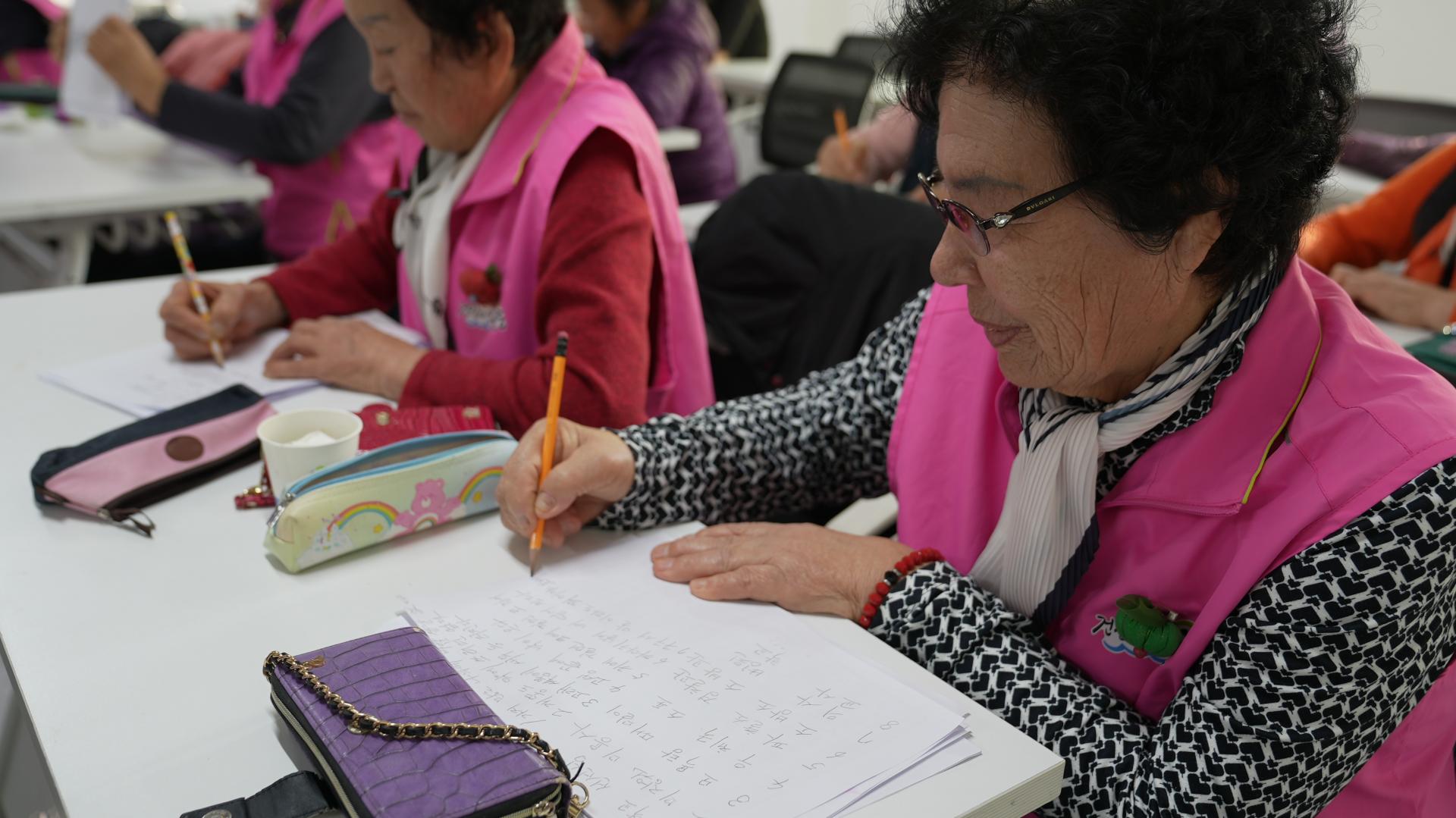 문해한글학교 섬사랑평생교육원 학생들이 글자를 받아적는 모습.