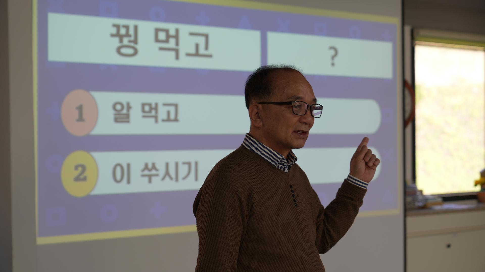 문해한글학교 섬사랑평생교육원 이두선 원장이 한글 표현을 가르치고 있다.