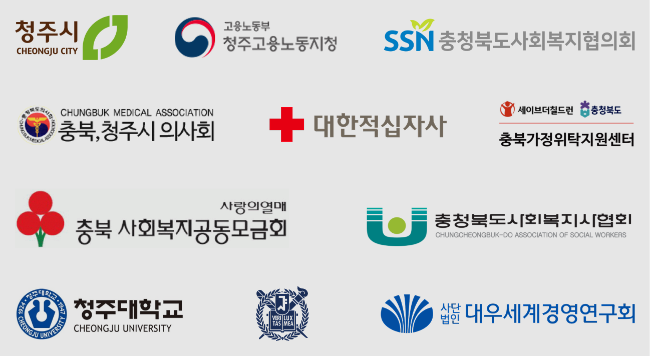 청주시, 고용노동부 청주지청, 청주시사회복지협의회, 청주시의사회, 대한적십자사 충북지사, 충북가정위탁지원센터, 충북사회복지공동모금회, 충북사회복지사협회, 청주대학교, 서울대학교 사회복지연구소, 대우세계경영연구회와 함께하고 있습니다.